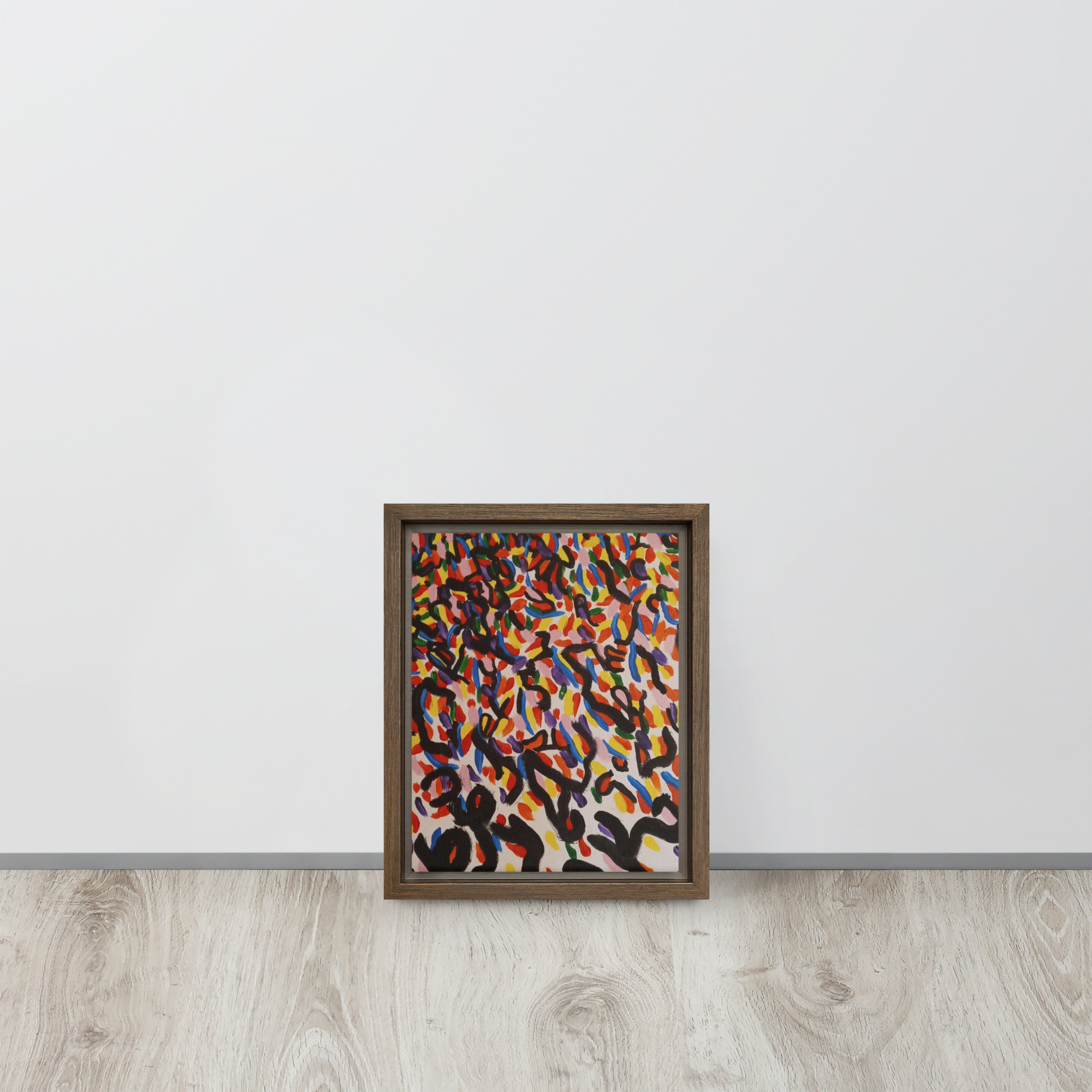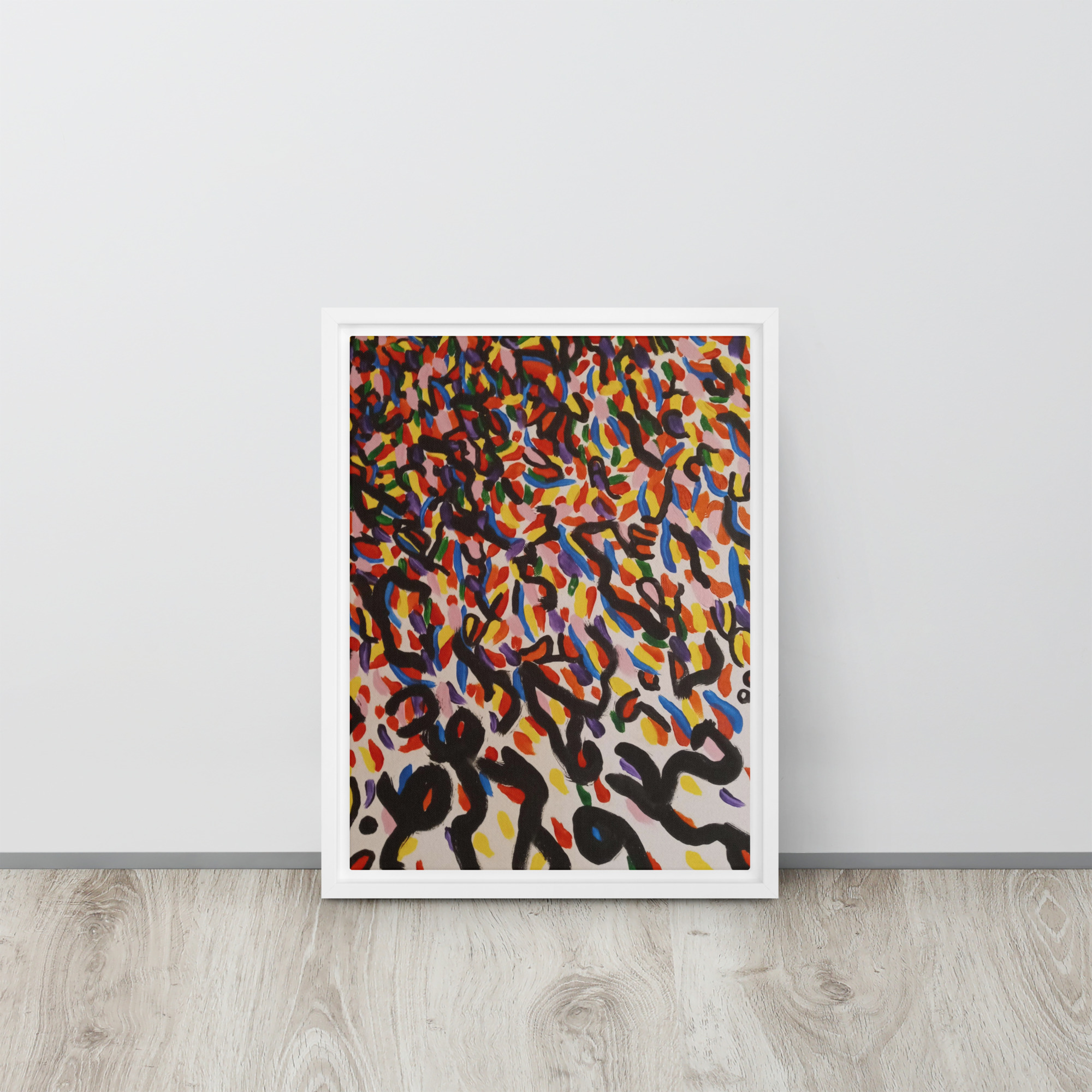 – The framed canvases with brown and black frames have a black inside around the canvas, and the canvases with white frames have a white inside around the canvas.