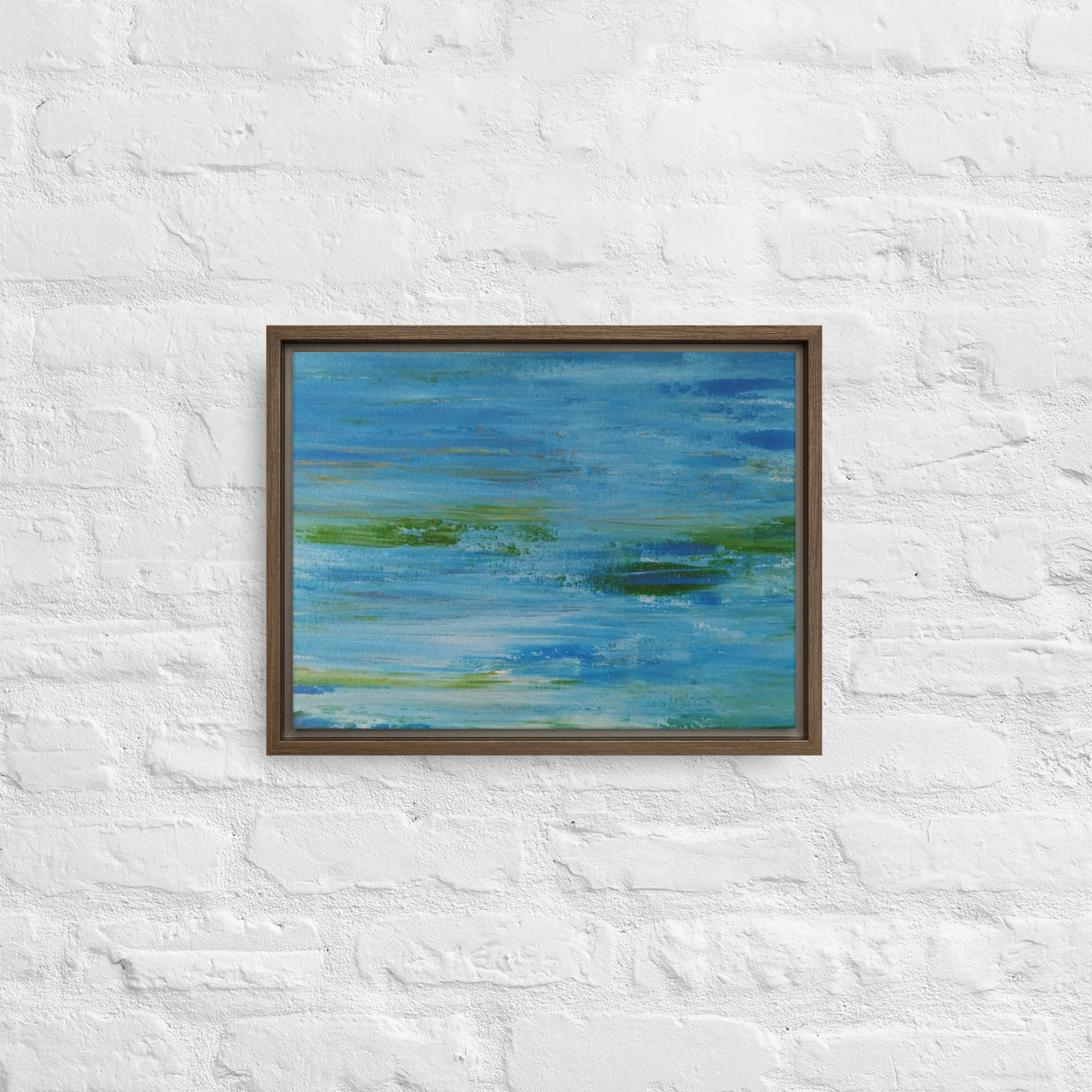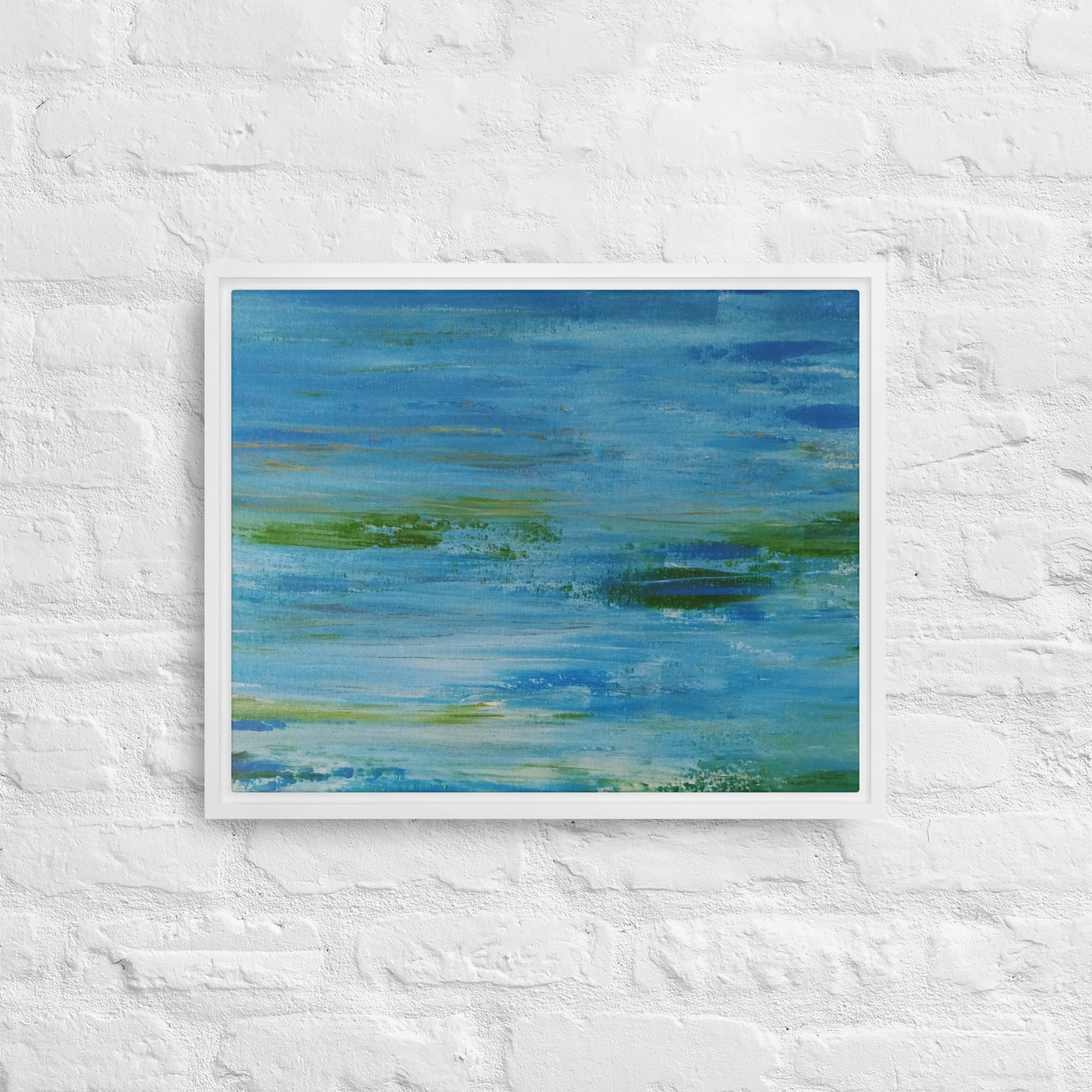 Inspired by the rivers of New England, The River by Kellyanne is a print on canvas of an original acrylic painting inside a floating frame.